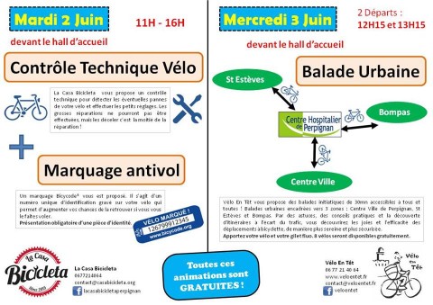 Vélo en Têt participera aux journées "Hôpital Durable" le 2 et 3 juin et proposera un stand d’information le mardi 2 et mercredi 3 juin de 11H à 16H ainsi que des balades urbaines encadrées sur la pause du midi du mercredi midi uniquement. 2 départs : 12H15 et 13h15. Balade de 30 mn pour découvrir les astuces de la circulation à vélo et les débuts des itinéraires possibles vers différents grands quartiers : Centre ville, Bompas et St Estève. L’idée n’est pas d’aller jusqu’à ces grands quartiers, mais de découvrir qu'il est possible de se déplacer à vélo parmi le trafic et de découvrir des possibilités d’itinéraire alternatif aux voies empruntées en voiture. 30 mn ne laisse pas assez de temps pour aller jusqu’à destination et revenir, mais on espère que cette forme plus courte permettra à plus de monde de profiter de l’occasion. Il s’agit aussi de faire connaitre la vélo école et d’inviter les gens à nous recontacter pour un cours individuels.