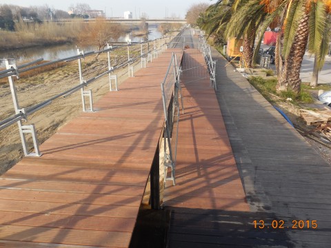 Comme la passerelle arrive sur les deux rives au dessus du niveau des voies existantes, il était nécessaire d'installer un escalier et une rampe, en bois côté Torcatis et en béton côté Théâtre. Côté Torcatis la rampe, comme toute la passerelle, sera partagée entre piétons et cyclistes. La rampe est juste assez large pour qu'un cycliste puisse monter ou descendre sur son vélo (voir photo). S'il rencontre un piéton, une personne à mobilité réduite ou une poussette de bébé, il sera obligé de mettre pied à terre. En plus, comme la rampe est en épingle, donc avec un virage à 180°, on sera obligé de descendre du vélo si on n'est pas VTTiste chevronnée.
