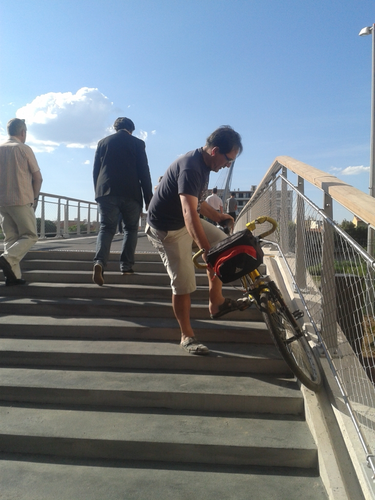 A chaque extrémité, vous pouvez utiliser le plan incliné pour éviter les marches (priorité aux personnes à mobilité réduite) ou le long de ces marches, une goulotte permet au cycliste d'y glisser ses roues, en inclinant le vélo vers soi pour que les pédales ne frottent pas (la goulotte de droite côté théâtre est mal implantée et nécessite de pencher énormément le vélo, nous avons sollicité une goulotte centrale plus pratique).