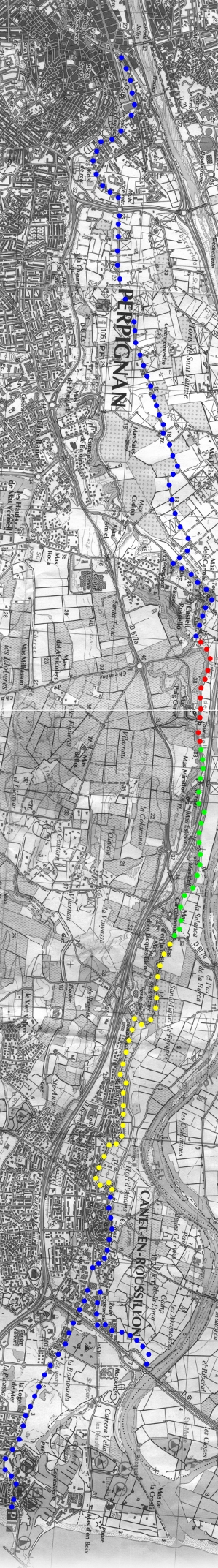 À la fin des années 1990, avant qu'on ne construise la voie rapide RD617-Perpignan-Canet, le CAUE [Conseil d'Architecture, Urbanisme et Environnement] avait déjà proposé qu'on aménage les berges de ce canal en parcours piéton et cyclable reliant Perpignan à la mer. Ce projet était très abouti et avait pris la forme d'un dossier de 64 pages, étayé de profils en travers, de plans d'aménagements... Il s'est hélas heurté à cette époque au projet de voie rapide, beaucoup plus cher et moins utile, mais qu'on lui a rapidement préféré...