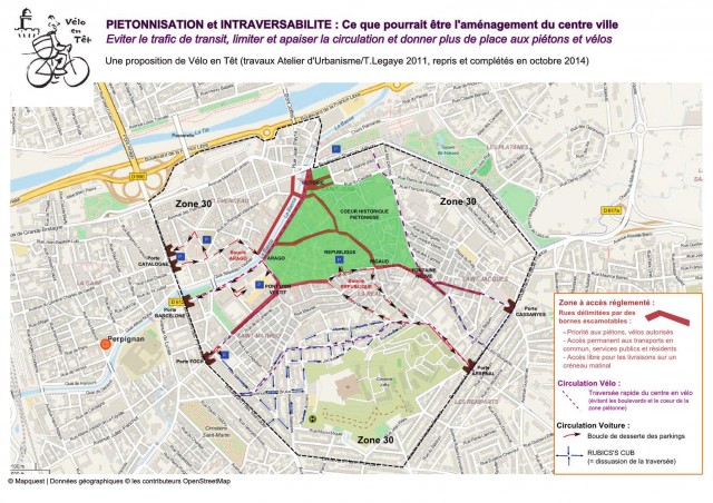 Thibaut Legaye avait travaillé lors d’une commission «La ville à Pied» à l'Atelier d'Urbanisme en 2011 sur le principe de dissuasion de la traversée automobile du centre ancien. De nouveaux éléments sont à prendre à compte dans un centre en pleine mutation : installation d’une annexe de l’Université place Fontaine Neuve, pôle muséal autour du Pont d’en Vestit, futur parking de la place Jean Moulin, nouvelle politique de la Ville, ... Il y a aussi bien sûr la décision de la Cour administrative d’appel de Marseille qui demande la mise en double sens cyclable (DSC) de la rue Foch et de l’axe Place Catalogne- La Basse.