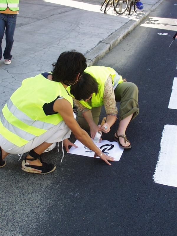 Mercredi 20 septembre sur l'av. Mermoz, de simples citoyens, armés de pinceaux et de pochoirs, ont donc réalisé une bande cyclable parfaite, que quelques dizaines de cyclistes privilégiés ont pu utiliser pendant une heure et demi, que toutes les voitures, les camions, les bus, ont respecté sans aucun problème de place, faisant ainsi la démonstration de la simplicité du procédé, de son faible coût, et surtout de son efficacité.