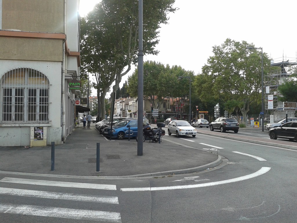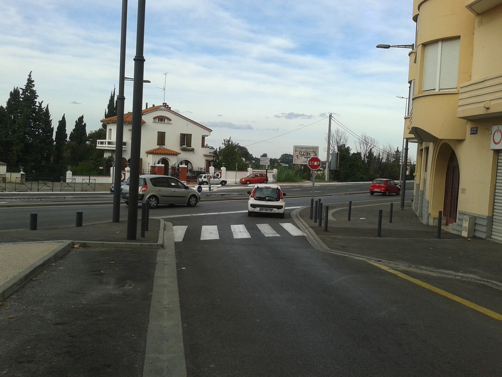 Depuis le passage du quartier Las Cobas en zone 30 avec de nombreux double-sens cyclables, les habitants de ce quartier pourraient se rendre en ville en toute sécurité s'il n'y avait pas une grosse discontinuité cyclable comme on a l’habitude de voir un peu partout dans Perpignan. Il n'existe aucun aménagement pour traverser la piste cyclable en face qui descend jusqu'au Palais de Congrès. A l'angle F.Mistral/A.France, on tombe sur trois voies très fréquentées par les automobilistes. Pas de feu ni passage piéton, une séparation centrale en béton avec un seul passage qui ne mène pas vers le trottoir d'en face mais droit sur le Cours Lassus qui monte à cet endroit.