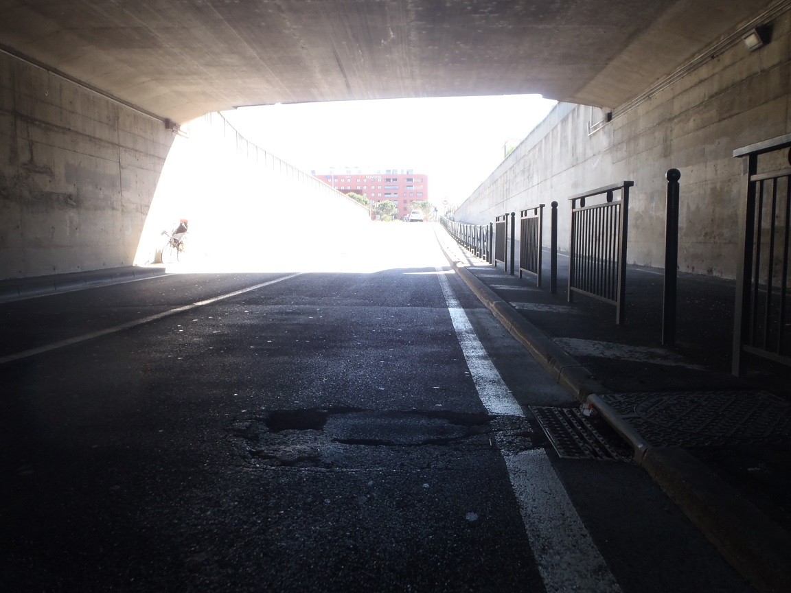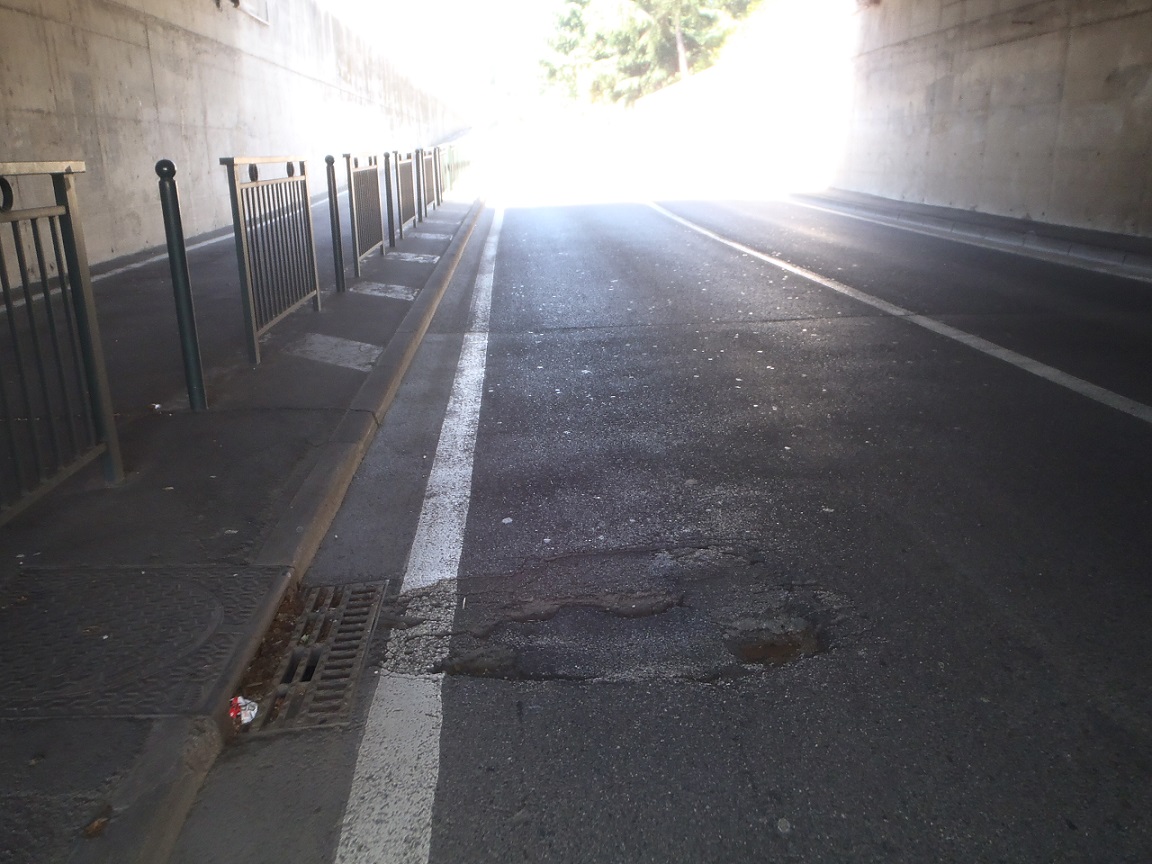 De la gare pour se rendre au Théâtre, le mieux, selon moi, est de franchir la pénétrante en passent dessous via l'avenue Joseph Rous. Malheureusement, un nid-de-poule assez profond s'est créé depuis assez longtemps sur la partie droite de la chaussée, rendant vraiment dangereux le fait de rouler sur le côté : gros choc déstabilisant avec risque de crevaison. Surtout que le contrsate important entre la lumière dans la descente et la pénombre en arrivant sur ce trou le rend presque impossible à déceler.
