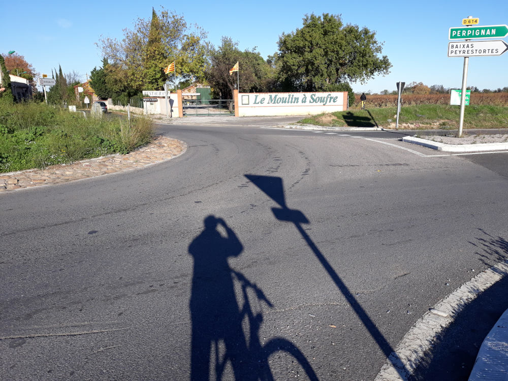 Dans la continuité de l'itinéraire depuis Peyrestortes au rond-point du Moulin à Soufre. Aucune signalétique pour indiquer la traverse alors qu'elle existe dans l'autre sens au niveau de l'accès Rombeau. Enfin, elle existait... Il manque aussi une signalétique au sol pour matérialiser la voie cyclable. Dommage pour les touristes en famille voulant rejoindre la voie verte depuis Baixas ou Peyrestortes. Il faudra qu'ils passent par la route et le plus souvent qu'ils prennent leur voiture. C'est plus simple.