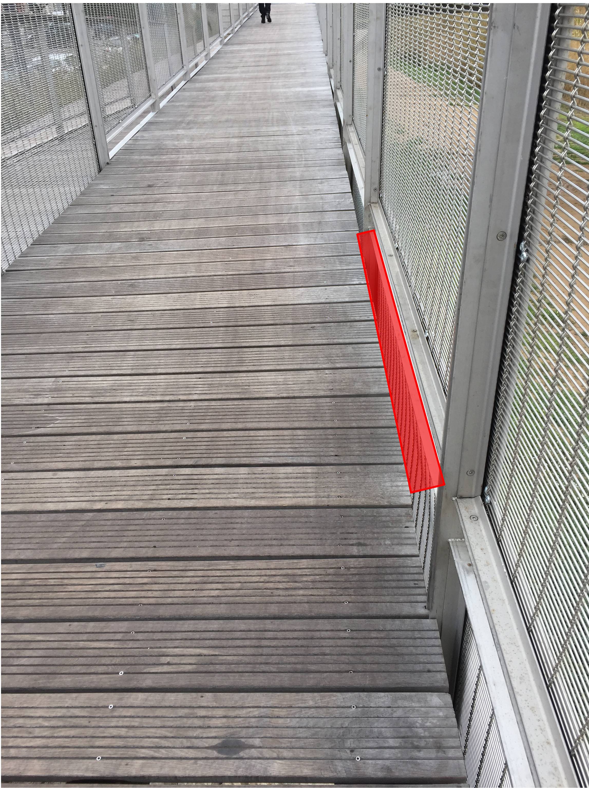 Au niveau de la rampe d'accès à la passerelle sur la Têt, rive gauche, du côté de l'avenue Torcatis, l'espace entre le bord des planches et la rambarde métallique est assez grand pour laisser passer un pneu de vélo, ce qui bloque la roue d'un coup. Résultat, une chute de vélo sur un ouvrage pourtant prévu pour les cyclistes.